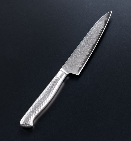 ステン&ニッケル◆63層ダマスカス一体型【ペティナイフ150】価格: 9,000円レビュー評価: 0.0 レビュー数:0 ●持続する切れ味 ●美麗なブレード ●清潔なハンドル中心の切刃はステンレス刃物鋼の最高峰『V金10号』(コバルト・バナジウム含有モリブデンステンレス高炭素刃物鋼)を使用しています。大変硬度が高く耐摩耗性に優れていますので鋭い切味が持続いたします。ブレードは軟ステンレスとニッケルを交互に積層した片面31層の多層鋼で美麗な輝きと強い強度を有します。切刃を含み合計63層の三層材を鍛錬したダマスカス仕様です。柄部も永久に腐蝕しない18-8ステンレスモナカハンドルで大変衛生的です。木柄と違い、高圧・高温殺菌洗浄でも柄が傷みません。食器洗浄機に対応いたします。 ■全長270mm 刃渡り150mm 重さ78 |